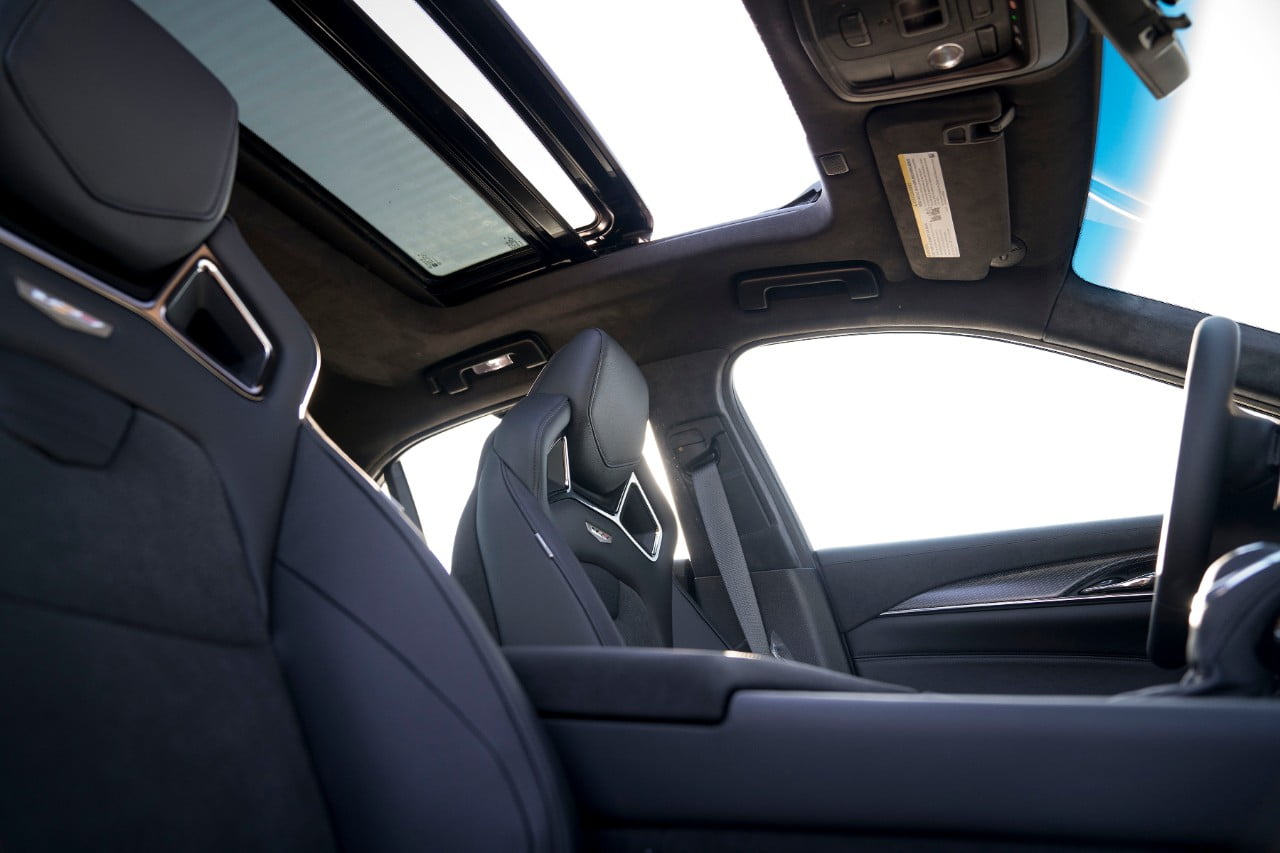 La cabina está repleta de acabados cuidados, fabricados con buen gusto y pensando en los ocupantes del auto. Diría que no tiende a lo “trendy”, sino más bien, a lo clásico y cómodo. Es obvio que el confort estaba en la mente de quienes diseñaron el Cadillac CTS-V. Se combinan bien las texturas y la luz ambiente le confiere un carácter íntimo realmente agradable.