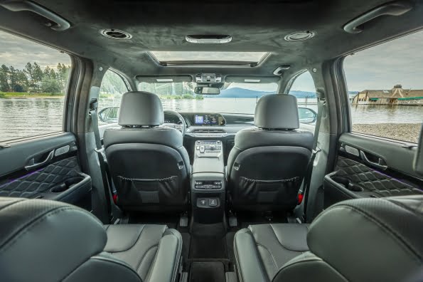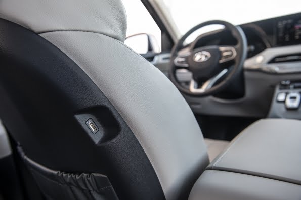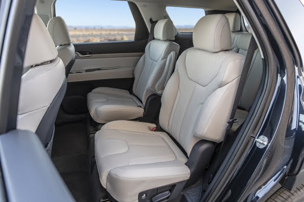 Al entrar en la cabina lo primero que observamos son lo detalles y la calidad de los materiales. En el modelo que tuve para la prueba, la tapicería era de cuero, incluyendo cuero Nappa, perforado y pespunteados en forma de diamante. El uso de texturas y colores crea un ambiente cálido y relajado, que además cuenta con detalles prácticos. Por ejemplo, para mover las butacas de la segunda fila -disponible con sillas estilo capitán- apenas se necesita pulsar un botón; y abatir las butacas en la tercera fila de asientos, también es tarea sencilla. El espacio es generoso y hay suficientes áreas en las que apoyar una bebida –16 apoya vasos– , el móvil, un Tablet o guardar objetos que deben quedar fuera de la vista, incluyendo una zona cubierta bajo el piso del maletero. Igualmente, es amplio el espacio en el área de carga: 21 pies cúbicos tras la tercera fila y 87 pies cúbicos abatiendo la tercera fila de asientos. Por si todo esto fuese poco, el Palisade puede remolcar hasta 5.000 libras