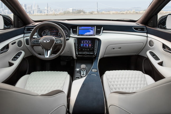 El Essential, ofrece el sistema de cámara 360 grados que comenté anteriormente, sistema de navegación, sensores delanteros y traseros, encendido remoto del motor, limpiaparabrisas automático, tres puntos de control de temperatura en la cabina, y tapicería de cuero. Este nivel ofrece, además, mayor oferta de opcionales, como por ejemplo, volante con calefacción y memoria para las posiciones de manejo, llantas de 20 pulgadas, calefacción en la primera fila de asientos, tapicería en cuero de primera, sistema de control de temperatura con más opciones, asientos con ventilación y persianas para los asientos posteriores. También pueden incluirse opcionales en materia de seguridad, como el alerta de tráfico posterior cruzado, control de velocidad crucero adaptativo, control con alerta de distancia respecto al vehículo que marcha delante, alerta de tráfico en punto ciego, y si es amante de la música y busca un excelente sonido, un sistema Bose de 16 parlantes. Si a todo esto se suma el paquete correspondiente, su QX50 podrá remolcar hasta 3000 libras.
