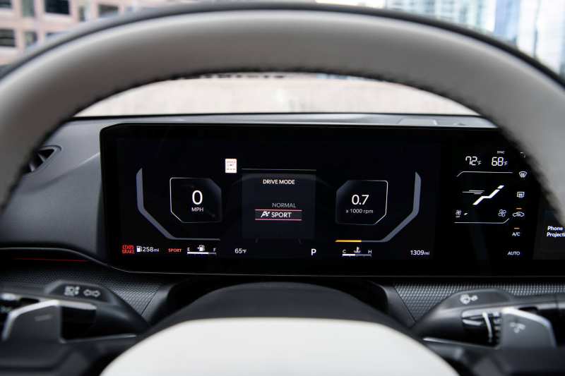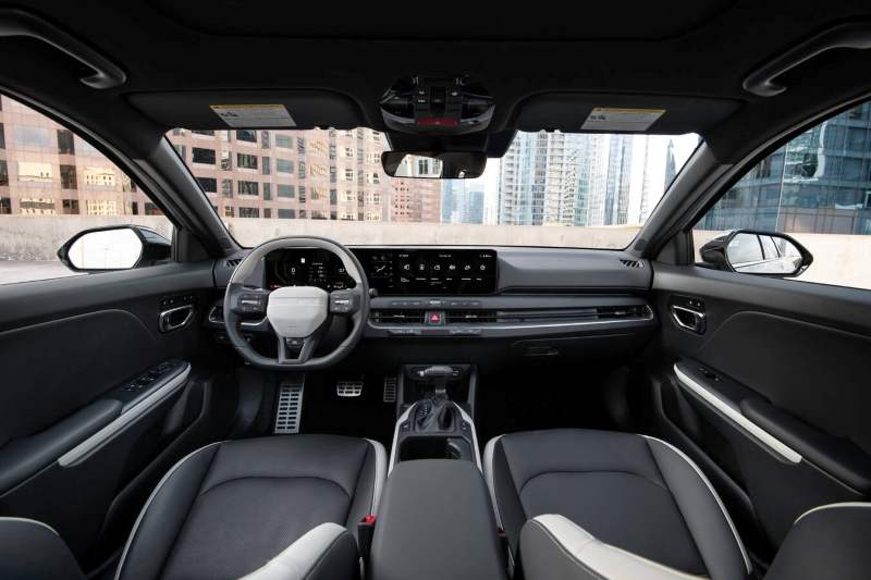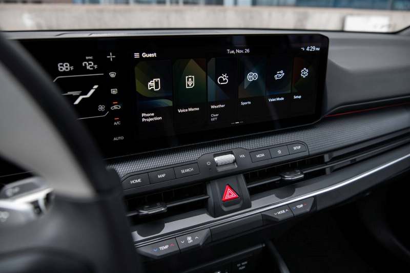 La parte frontal del Kia K4 GT-Line 2025 está dominada por una pantalla rectangular, continua, de 30 pulgadas que combina el panel digital y la pantalla táctil, cada uno de 12,3 pulgadas.